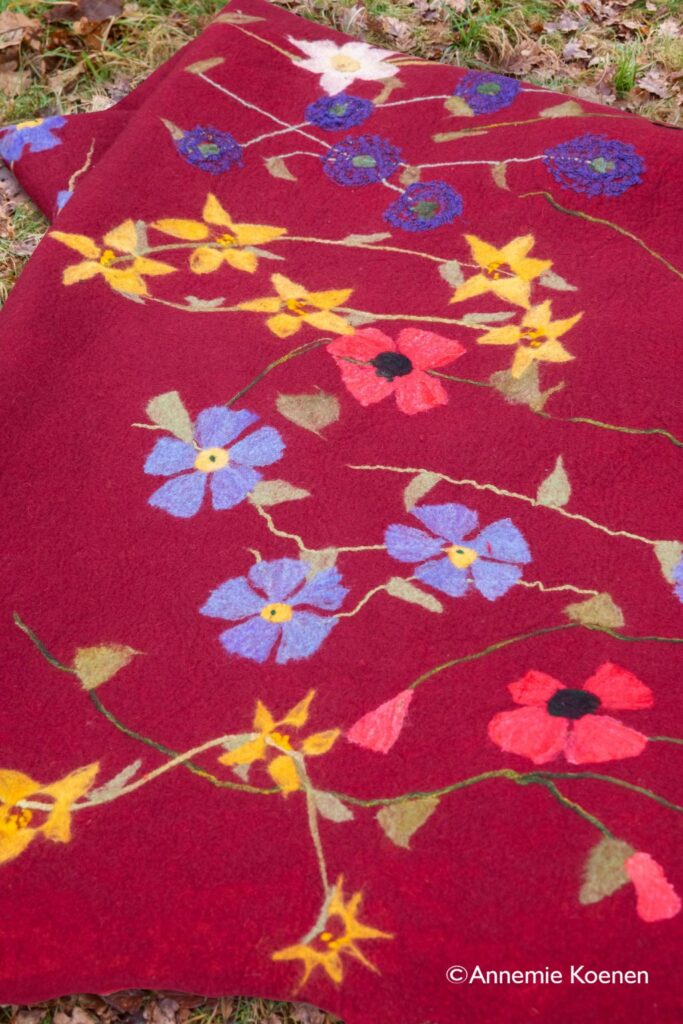 In unserem ersten Gespräch war es mir besonders wichtig, mir ein möglichst klares Bild von ihrer Vorstellung zu machen. Wir entschieden uns gemeinsam dafür, die Mohnblumen nicht in den Farben der Chakren zu gestalten, sondern sowohl das Leichentuch als auch die Mohnblumen rot zu färben. Während der wochenlangen Beratung und Anfertigung beschäftigte mich dieser Prozess ständig. Das Leichentuch wurde zu unserer beider großen Zufriedenheit fertiggestellt. Es war mir eine besondere Ehre, dies tun zu dürfen.