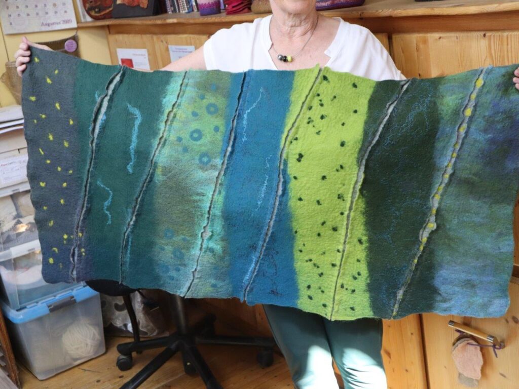 Es war eine fantastische Woche in deinem Atelier! Ich habe viel gelernt. Gemeinsam haben wir einen wunderschönen Wanddekoration und eine tolle Mütze aus Stoffstreifen gefertigt. Für beide Projekte haben wir die Filzmaschine benutzt, was eine neue Erfahrung für mich war. Vielen Dank, liebe Grüße, Ada