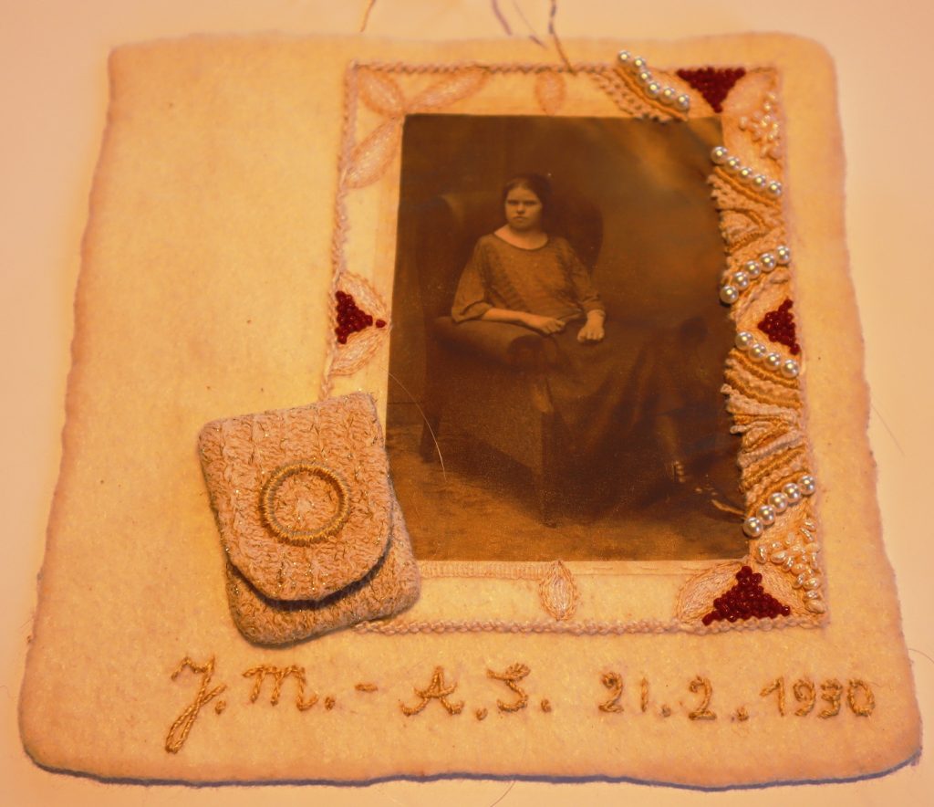 When embroidering the notebook, I noticed that there was a deep connection. I also notice that when embroidering this page. I know the picture, I’ve seen it many times. But never as close as when I embroider this list. Never before have I looked so closely at her eyes. Never before have I felt so connected to this grandmother I was named after.