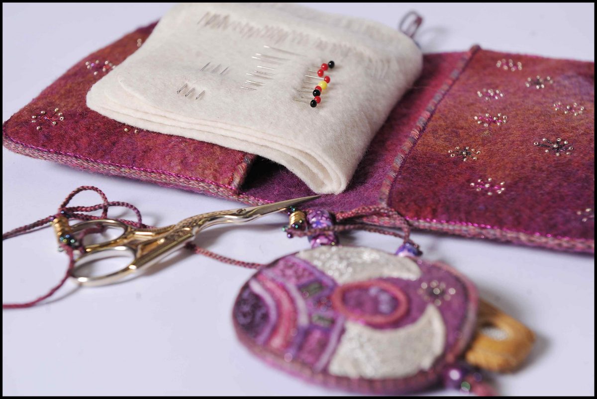 We felt a flat surface from which we cut the different parts for the embroidery case or we work around a template and work the inner compartments in one piece.