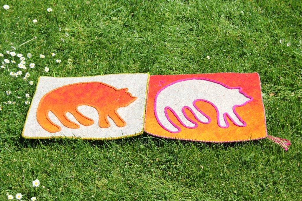 Finished felt is cut, reassembled in the opposite color and sewn together using handmade cords.