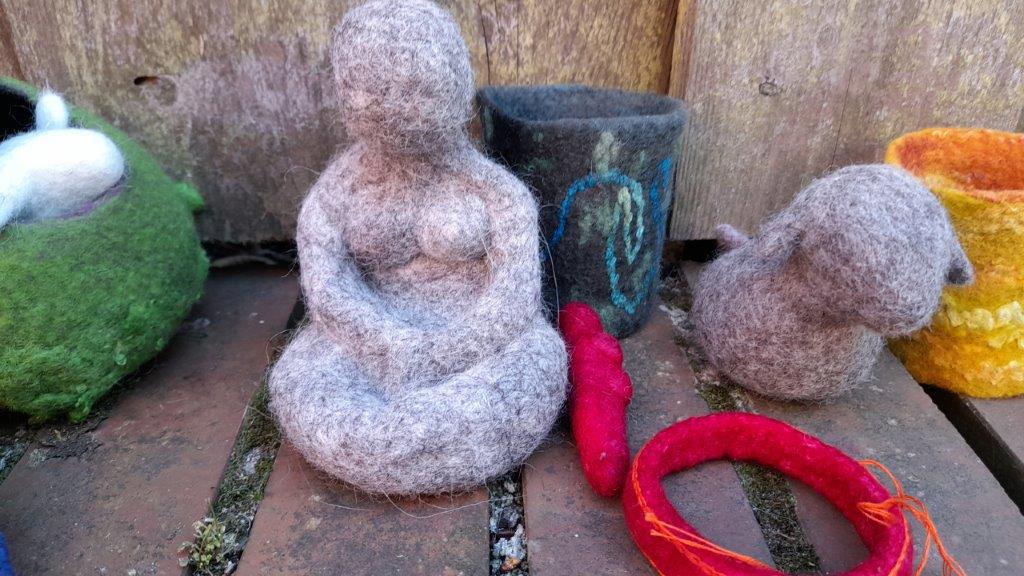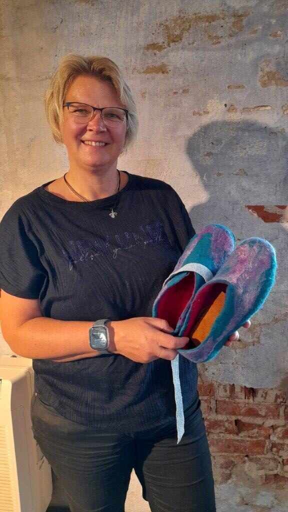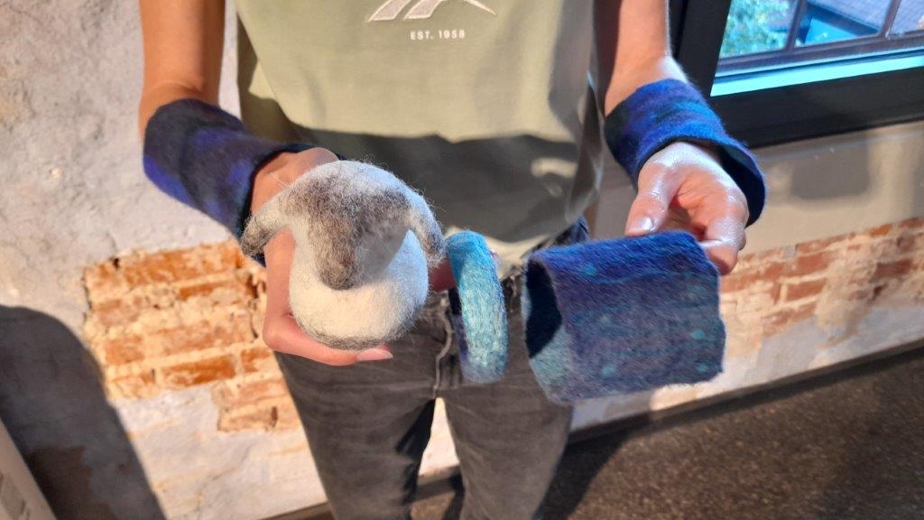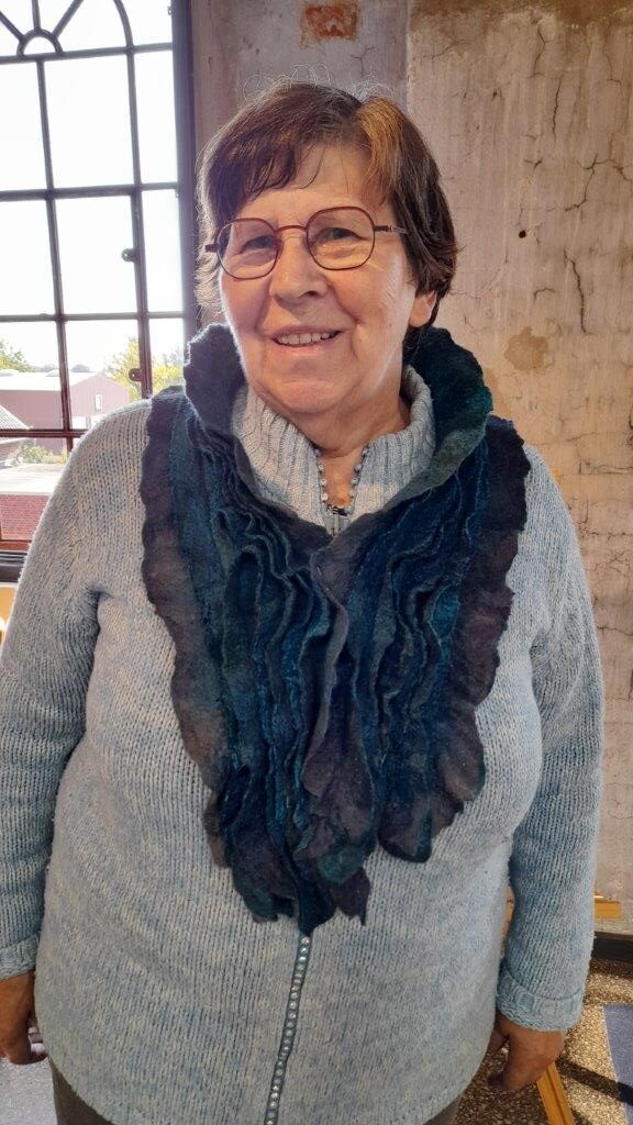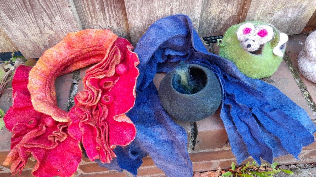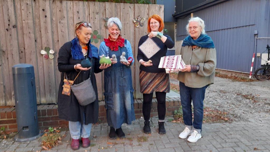 Es war mir eine grosse Freude und auch Ehre, mit Dir, unter Deiner humorvollen und gestrengen Kompetenz filzen und insbesondre lernen zu dürfen. – This has been a wonderful time for me – felting with you in beautiful Felto. I have learnt so many new techniques and to be more careful and very importantly patience with my work. Annemie has a great skill in helping evryone in her class doing different projects, but still giving precise guidance for each step. – Ich liebe deine unendliche Geduld, dein wunderbares Niederländisch-Deutsch (das so entzückend nett klingt) und deine versteckte Strenge, in der du dann doch bei aller Encheidungsfreiheit darauf achtest, dass ich fachlich, alles schön ordentlich und richtig mache. Du nimmst alle deine Teilnehmerinnen, wie sie eben sind!