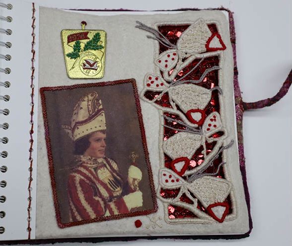 These pages for the memory book are 21 x 21 cm. That is very small for a flag. That’s why we printed the patron saint and the bird on felt. The narrower gold lines are embroidered with the prehistoric stitch because the ribbon is also too large in this size.