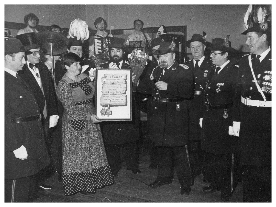 Mom did this work on a voluntary basis with or without compensation for the materials. But she really appreciated it when she was honored for it, as in the photo with the certificate of the Schutterij.