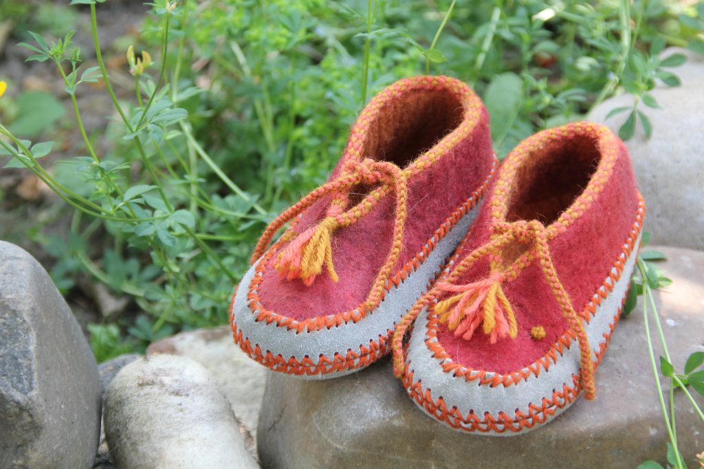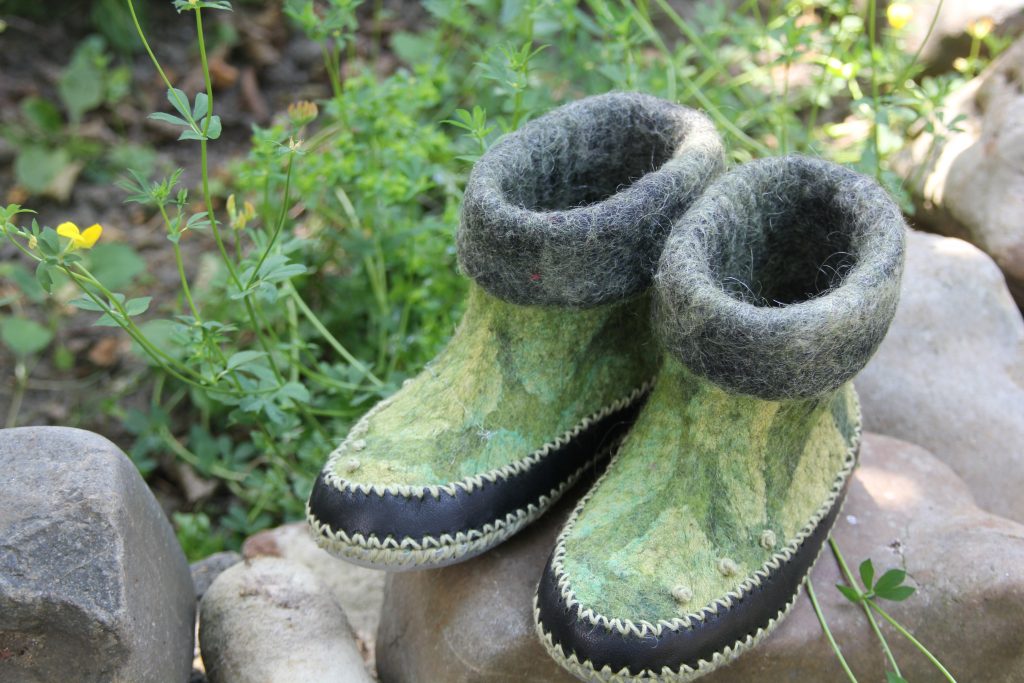 We maken hoge sloffen. Deze sloffen worden aan een stuk gevilt.We maken een mal van ondervloer en wanneer er genoeg ...